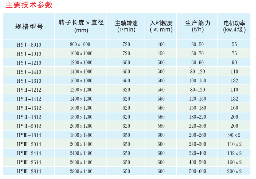 | 规格型号 | 转子长度*直径(mm) | 主轴转速(r/min) | 入料粒度(≤mm) | 生产能力(t/h) | 电机功率(kw.4级) |
