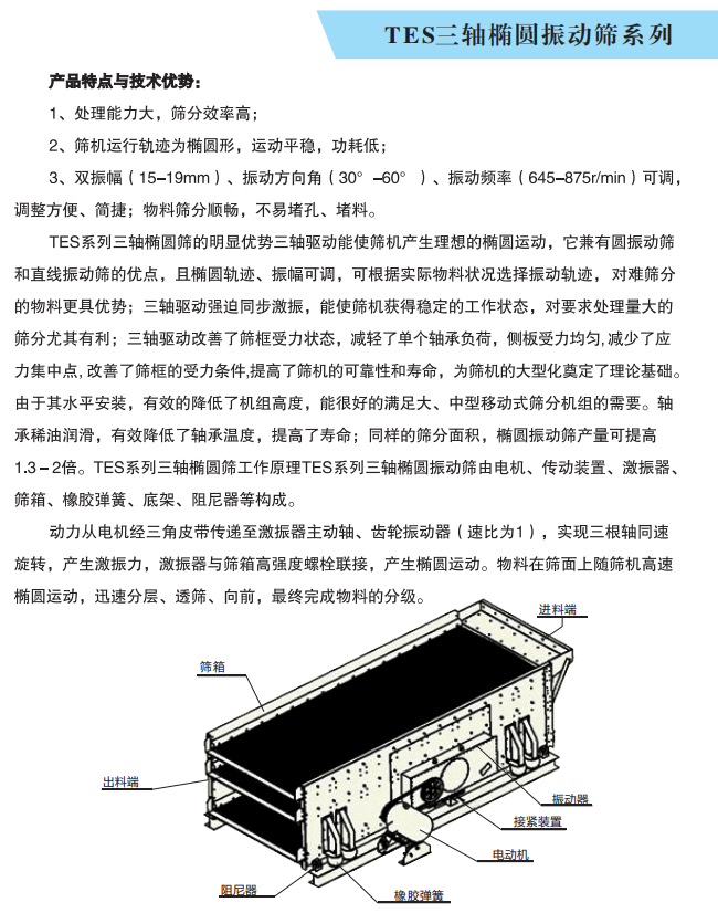 产品简介】SPS型水平式三轴椭圆振动筛兼备了倾斜式圆振动筛和水平式直线振动筛的各自的优点,具有透筛性好、处理能力大、安装高度小的特点,是各种矿山,石矿场,移动式筛分站的理想设备。